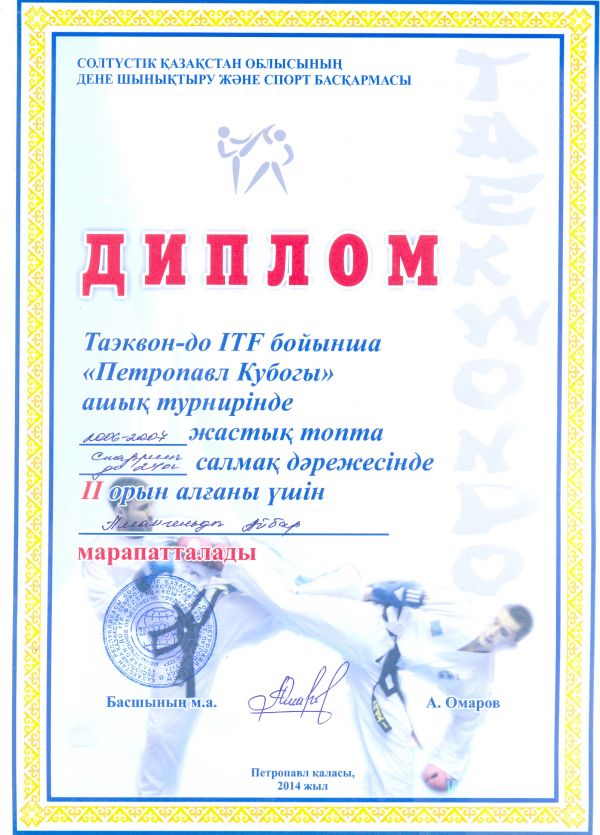 В первенстве города Караганды по таэквондо, которое проходило 30 марта 2014 года, Амангельды Айбар занял второе место вреди мальчиков, в весовой категории 25кг, в программе "Спарринг"
