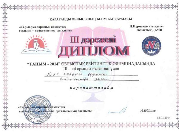 Байболсынова Даяна получила диплом 3 степени в областной олимпиаде