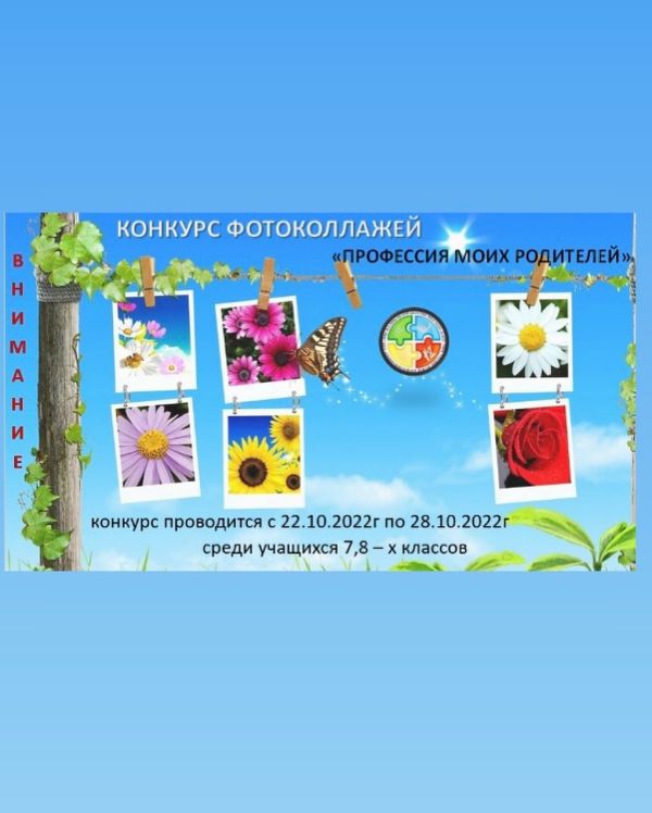 В рамках проведения "Недели профориентации" с 22.10.2022г по 28.10.2022г проходит конкурс фотоколлажей на тему: "Профессия моих родителей" среди учащихся 7,8-х…