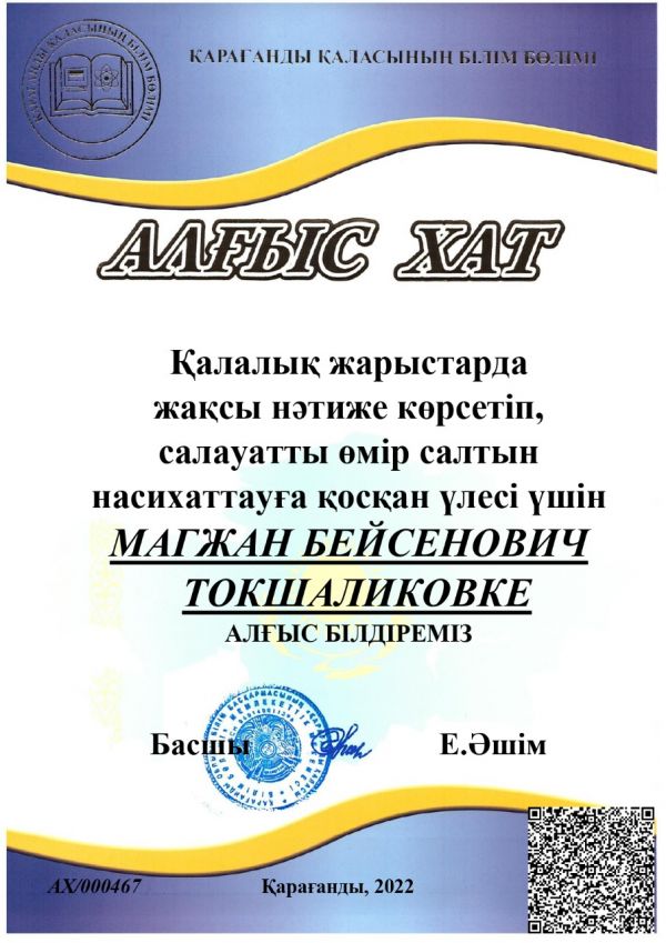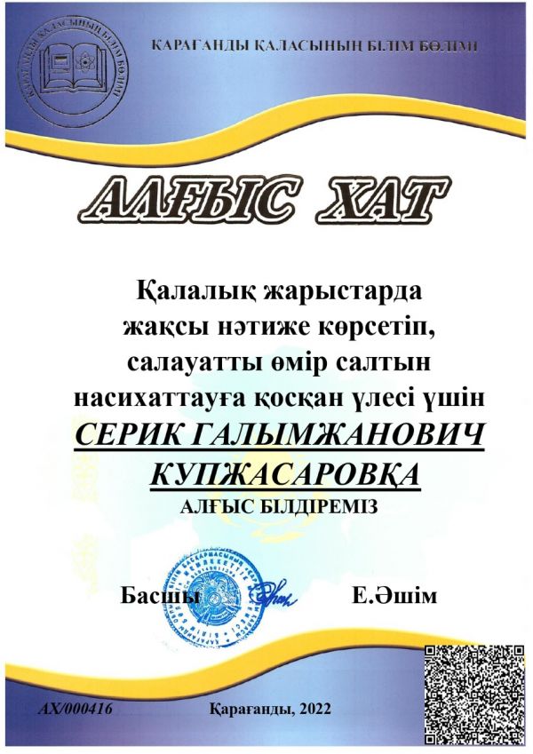 Қалалық жарыстарда жақсы нәтиже көрсетіп, салауатты өмір салтын насихаттауға қосқан үлесі үшін Токшаликов Магжан Бейсенович, Купжасаров Серик Галымжанович Қарағанды қаласының білім бөлімінің алғыс х…