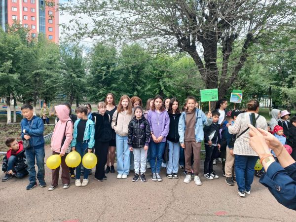 Наш лагерь"Солнышко" дружно идёт на открытие 1сезона в ОШ#59.Помним и соблюдаем все правила движения!
