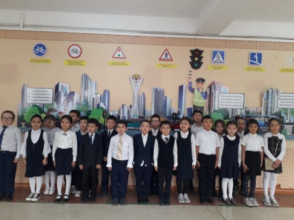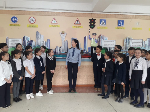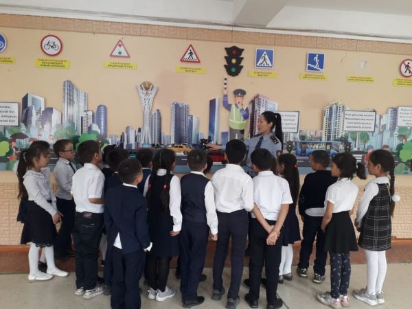 Старший лейтенант полиции Юго-Восточного ОП Ускембекова У.Б и стажер Қайыржан Ж.Е в рамках республиканской акции "Внимание дети!" в целях предупреждения дорожно- транспор…