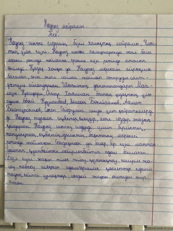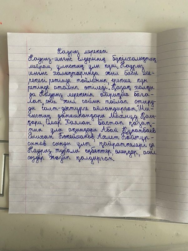 Көктемдік демалыс кезінде 4"б"сынып оқушылары Наурыз мерекесі атты тақырыпта эссе жазуда.