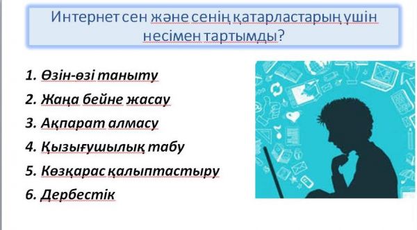 Мақсаты: интернетке тәуелділікті болдырмау, зияны мен пайдасын ажырату.
