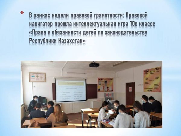В рамках недели правовой грамотности: Правовой навигатор прошла интеллектуальная игра 10в классе «Права и обязанности детей по законодательству Республики Казахстан»