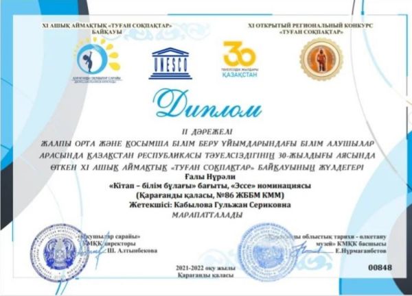 Қазақстан Республикасы Тәуелсіздігінің 30-жылдығы аясында өткен Xl ашық аймақтық "Туған соқпақтар"байқауының "Кітап -білім бұлағы Эссе"номинациясы бағытын…