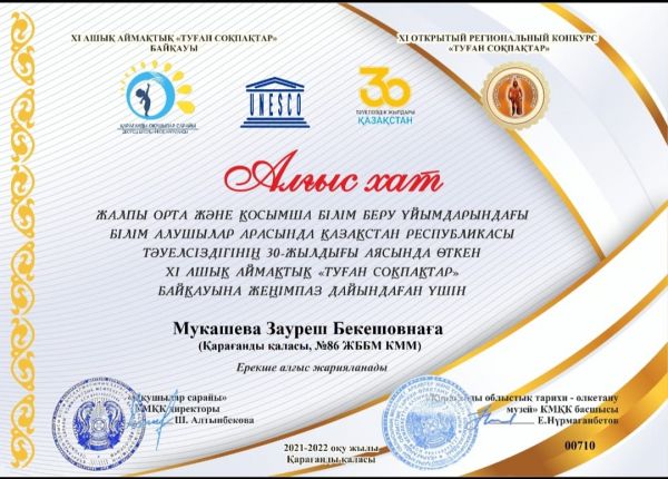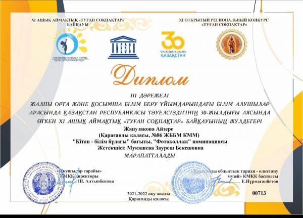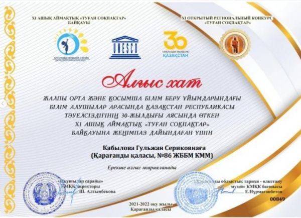 Қазақстан Республикасы Тәуелсіздігінің 30-жылдығы аясында өткен XI ашық аймақтық "Туған соқпақтар"байқауының жүлдегерлері "Саналы азамат","эссе" номинациясы бағытында 2…