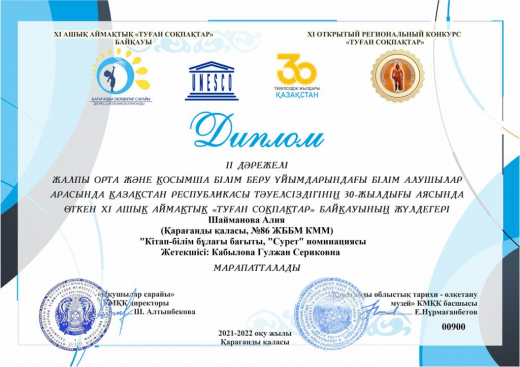 12.02.2022 күні Нұр-Сұлтан қаласында «Алаш өнер орталығының» ұйымдастыруымен өткен Халықаралық «Жұлдызды сәт»өнер байқауында «көркем сөз» номинациясы бойынша өнер…