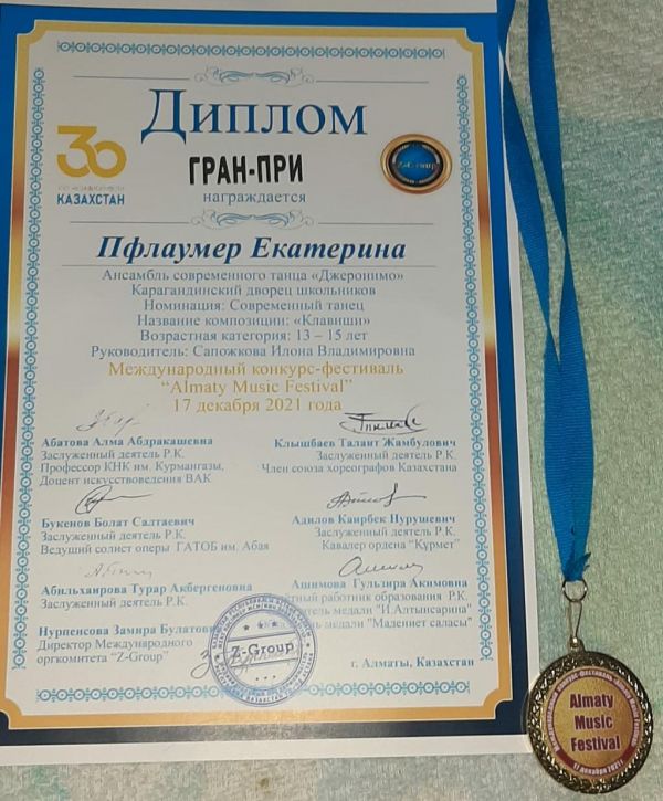 Пфлаумер Екатерина, ученица 6 "Г" класса, приняла участие в Международном танцевальном конкурсе (г.Алматы), где заняла Гран -- при. Поздравляем!
