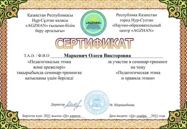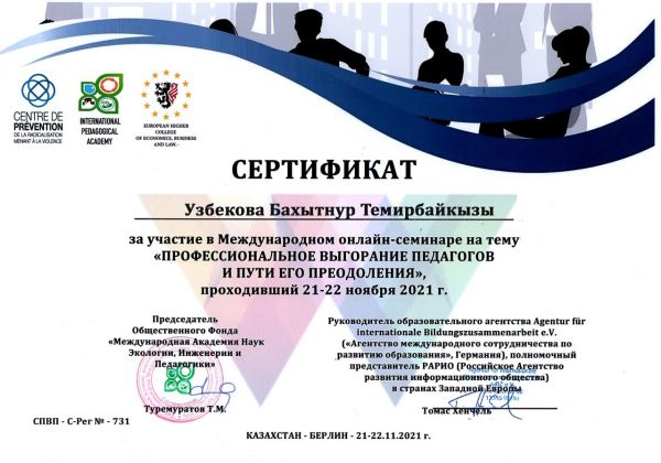 С 21.11-22.11.21г. Узбекова Б.Т.приняла участие в Международном онлайн- семинаре на тему " Профессиональное выгорание педагогов и пути его преодоления ".