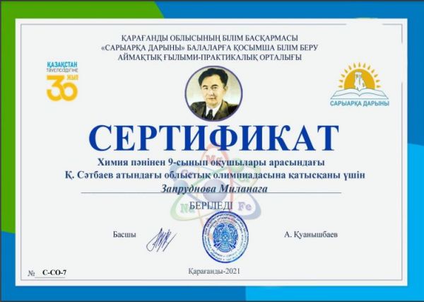 Ученица 9б класс Запруднова Милана принимала участие в олимпиаде по химии.