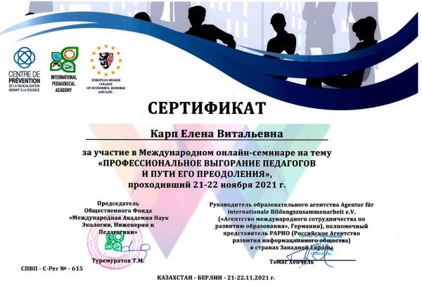 Международной онлайн семинар на тему "Профессиональное выгорание педагогов и пути его преодоления"