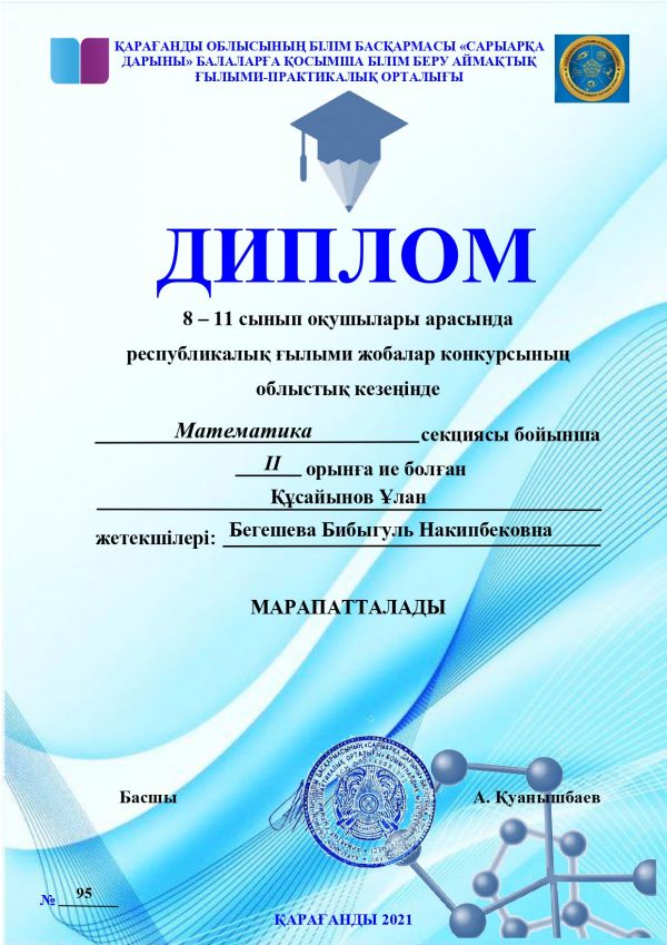 8-11 сынып оқушылары арасында республикалық ғылыми жобалар конкурсының облыстық кезеңінде 2 орын алған 11 сынып оқушысы Ұланды және жетекшісі Бибигуль Накыпбековнаны құттықтаймыз! Білімнің шыңын бағ…