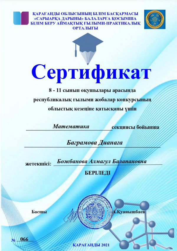 ҚарМУ-дың ұйымдастыруымен қазақ мектептерінде орыс тілі мен әдебиеті пәнінен 10 сынып оқушылары арасында ұйымдастырылған облыстық олимпиадаға қатысып, Аңғар Аружан Грамотамен марапатталды. Жетекшісі…