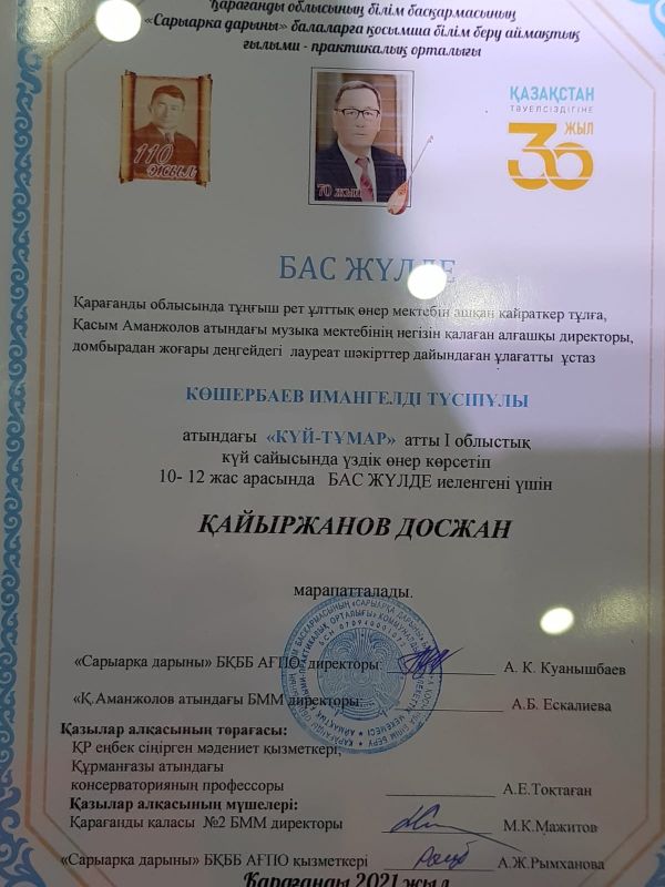 Қазақстан Тәуелсіздігінің 30жылдығына ұйымдасты рылған Қарағанды облысында тұңғыш рет ұлттық өнер мектебін ашқан қайраткер тұлға, ұлағатты ұстаз И.Т. Көшербаев атындағы "КҮЙ-ТҰМАР" атты 1о…