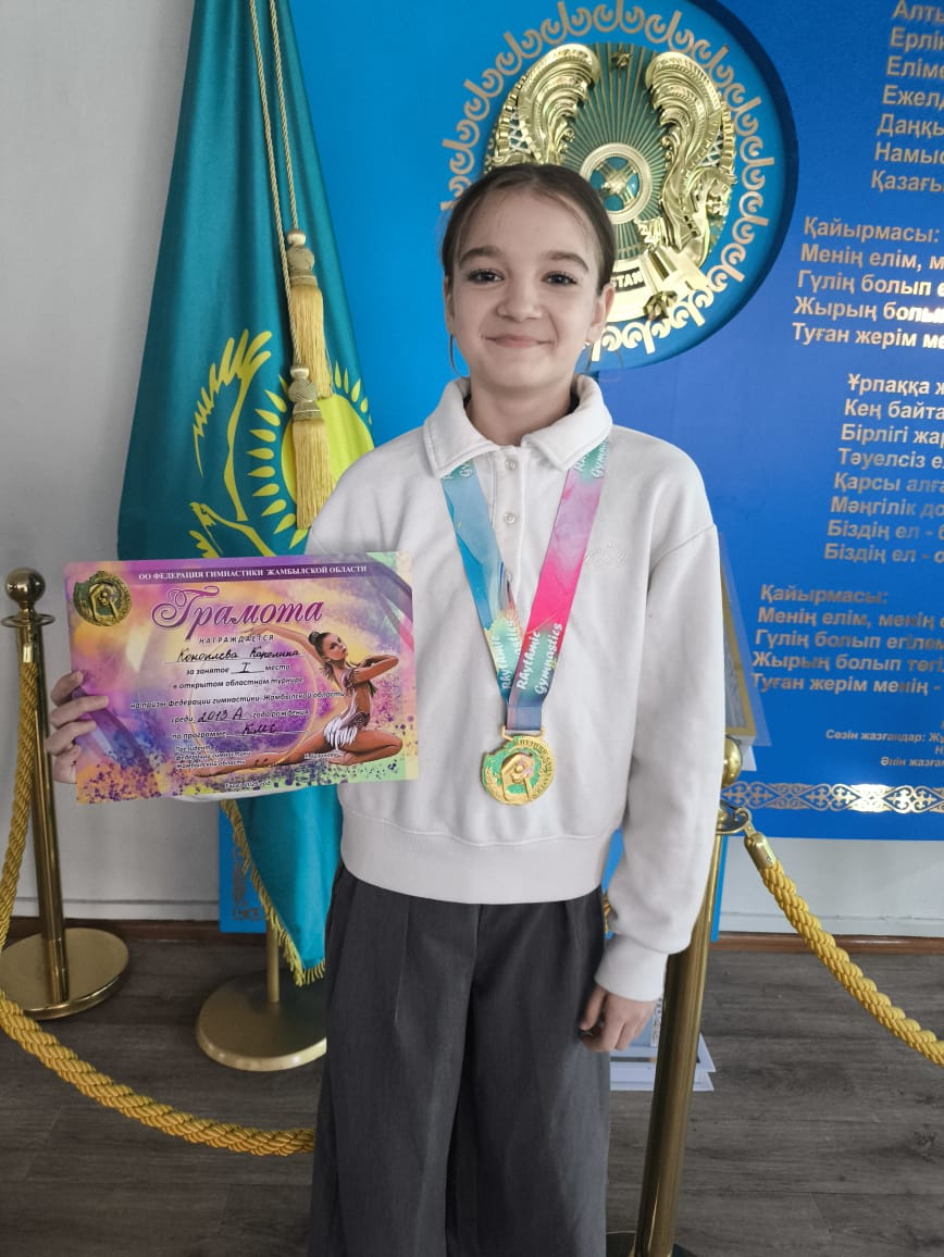 Ученица 6"Б" класса Коноплева Каролина приняла участие в областном турнире по воздушной гимнастике в Жамбылской области, где показала отличный результат и заняла 1 место!!!