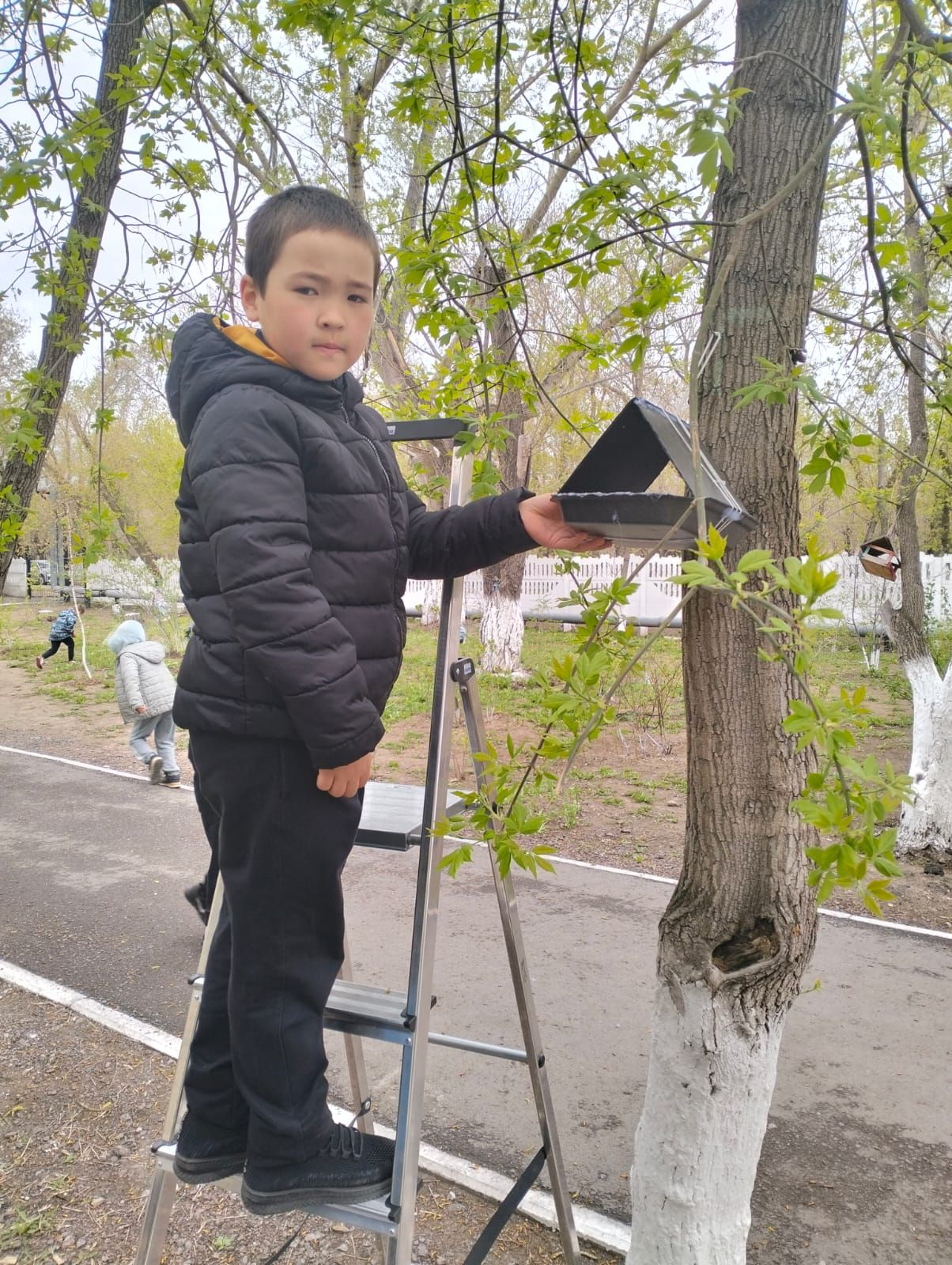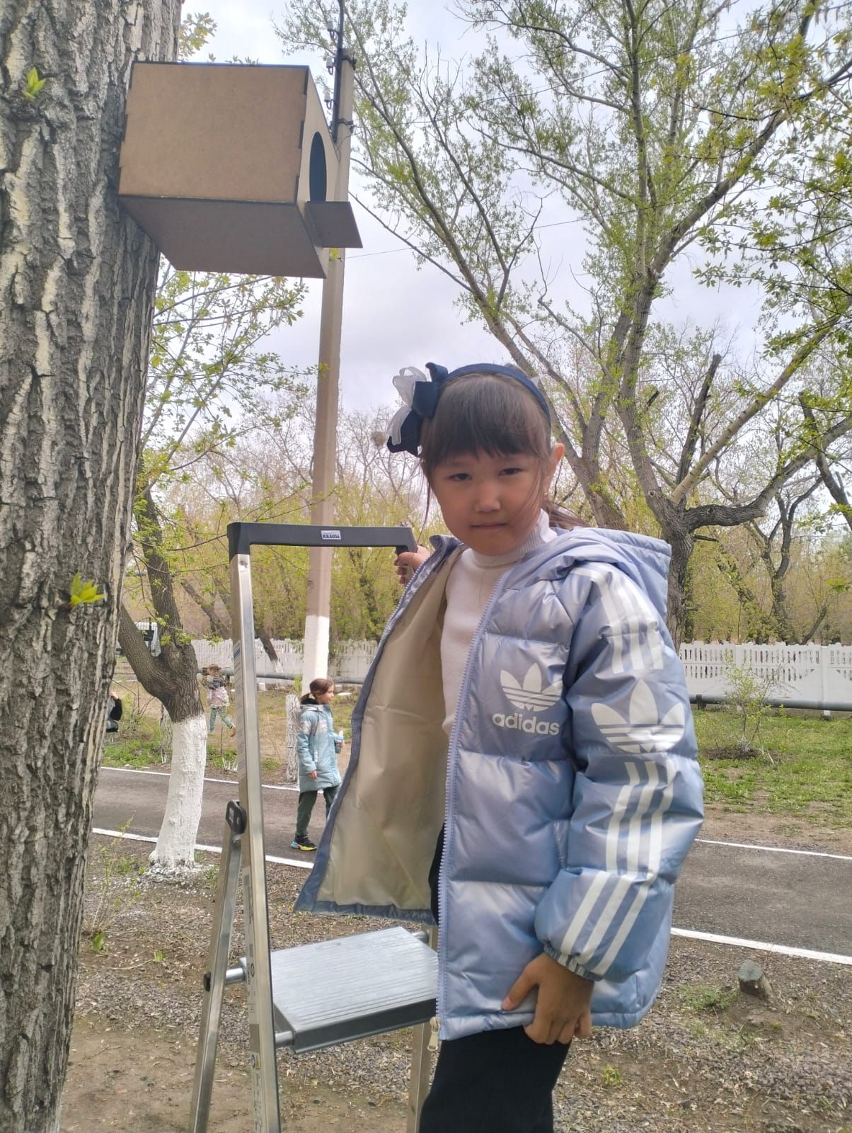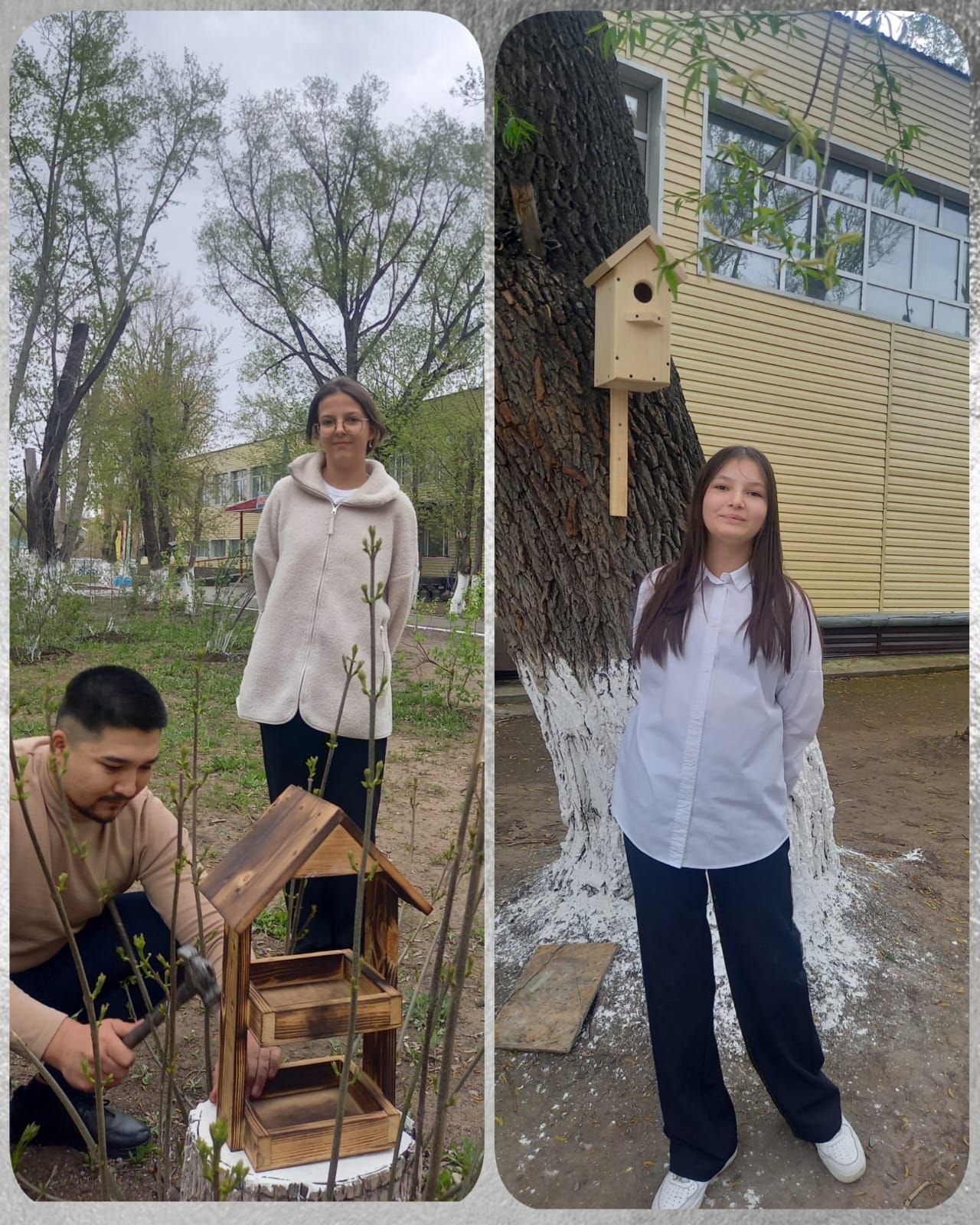 6 "Г" сынып оқушылары Сатюкова Кира мен Шарашенидзе Мариам және ата-аналарымен бірге құс үйін , құс қоректендіргішті жасап, мектеп аумағына іліп қойды.