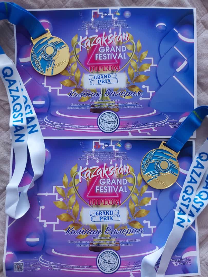 21апреля в г.Караганда состоялся конкурс Grand Festival, ученица 3«Е» класса Комник Валерия со своим коллективом заняла два Гран При.Поздравляем Валерию!Желаем творческих успехов .