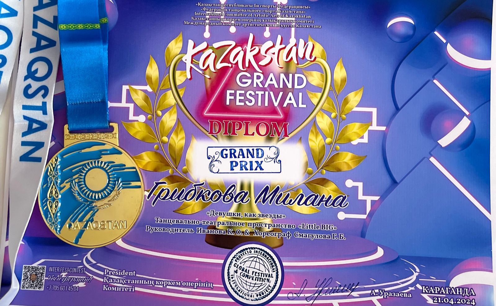 Ученица 6"А" класса Грибкова Милана заняла почётное Гран-при в двух номинациях со своим коллективом на конкурсе танцевальных коллективов "Kazakhstan Grand Festival", который сост…