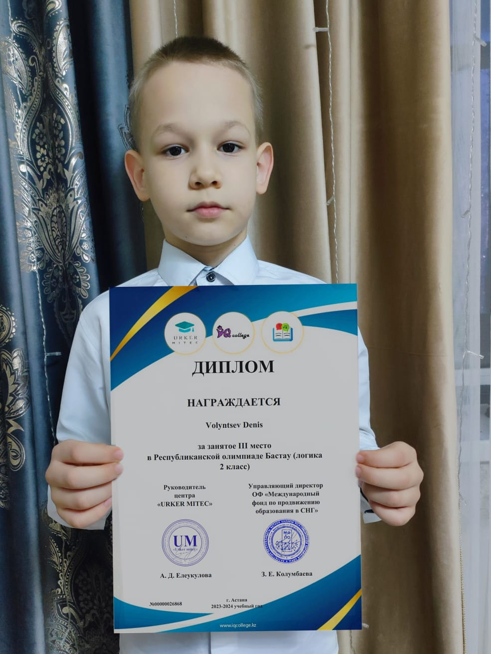 ПРЯДУН АНАСТАСИЮ, ХОХЛОВУ ЯНУ, КАЛГУЖИНОВУ ИСЛАНУ, ВОЛЫНЦЕВА ДЕНИСА, учащихся 2"А" класса, с победой в Республиканской дистанционной олимпиаде "Бастау&…