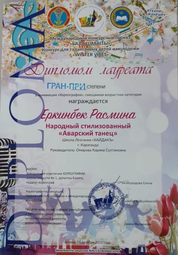 Ученица 6 "Д" класса Еркинбек Расмина в Международном конкурсном проекте "Бала шабыты" стала обладателем Гран-при в номинации "Хореография". Она исполнила народный стил…