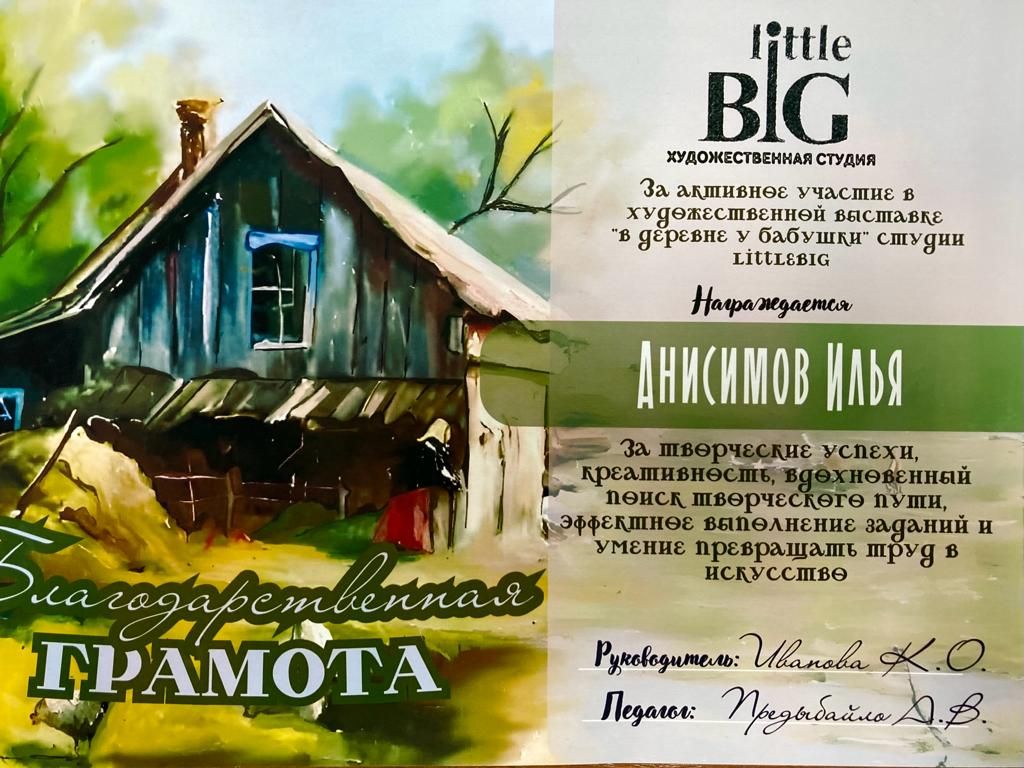 Ученик 2,,Г’’ класса Анисимов Илья.Творчество – это способ отразить своё состояние души. Оно даёт человеку чувство радости и удовлетворения.Дальнейших творческих успехов, Илья !