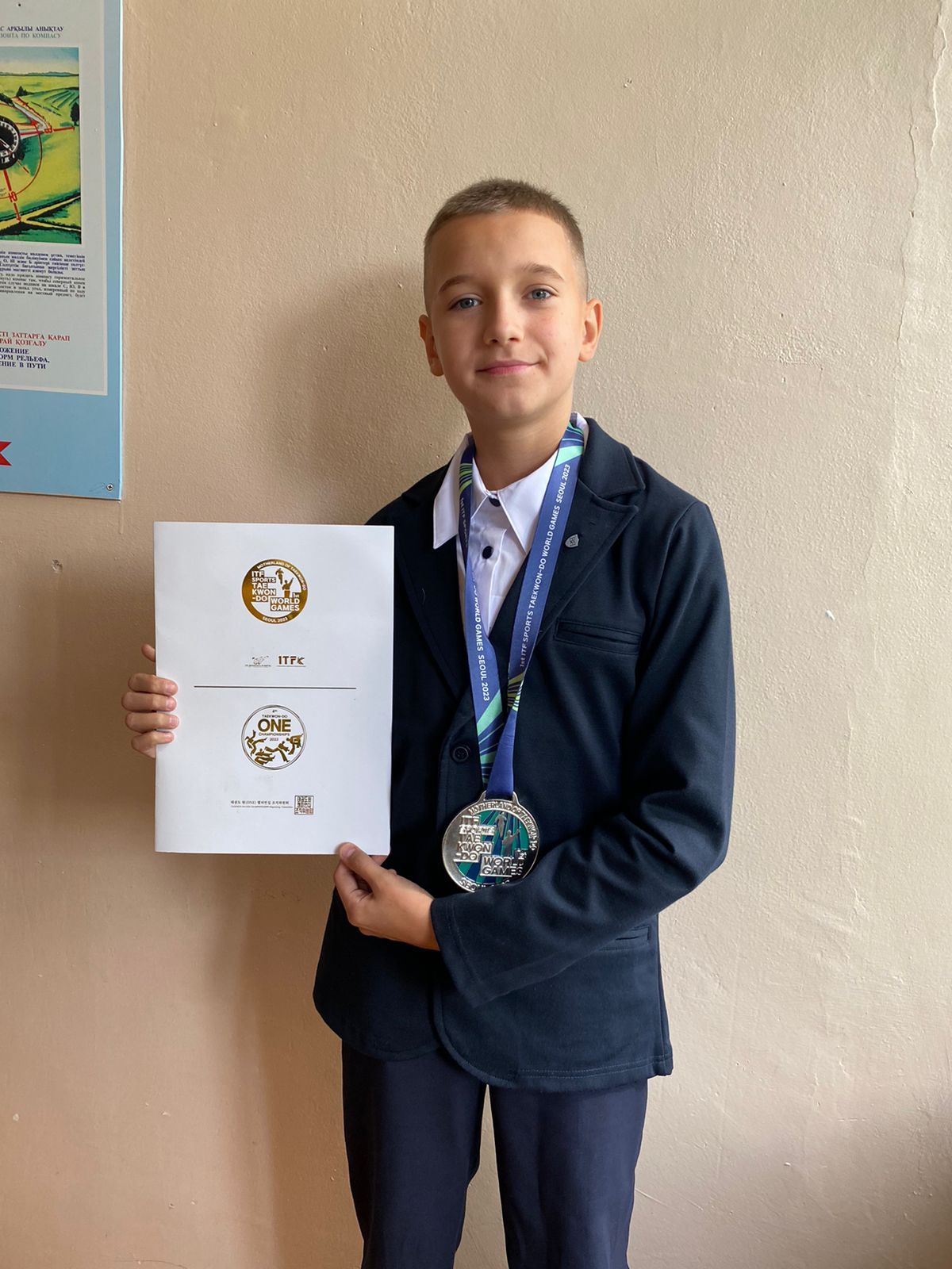 Ученик 7 «Г» класса Коноплев Илья. Чемпионат мира по тхэквондо ИТФ -Южная Корея. Участвовало более 30 стран мира. У Ильи были 2 соперника с Японии и Южной Корее. Он взял серебро ! Уступи…