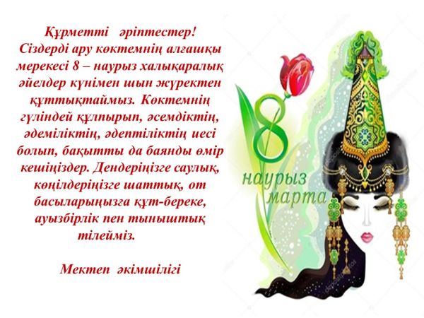 Бұл күн 8 наурыз қандай керемет! 8 Наурыз-көктемгі әйелдер мерекесі. Өйткені, бұл әр балаға ең сүйікті және қымбат аналар мен әжелердің мерекесі. Көктем мерекесі қарсаңында " 8 наурыз-анамның…