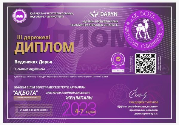 1 "А" сынып оқушысы Веденских ДАРЬЯНЫ "Ақбота" республикалық қашықтық олимпиадасына қатысып, 3 орынға ие болуымен құттықтаймыз!!!