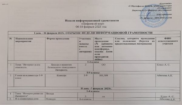 "Цифрлық әлем" апталығы аясында 2023 жылдың 6 ақпанда 2 сыныптарға арналған "Интернет және оның қауіптігі" тақырыбында әңгіме өткізілді. Мақсаты: оқушыларға интернетті дұрыс пайд…
