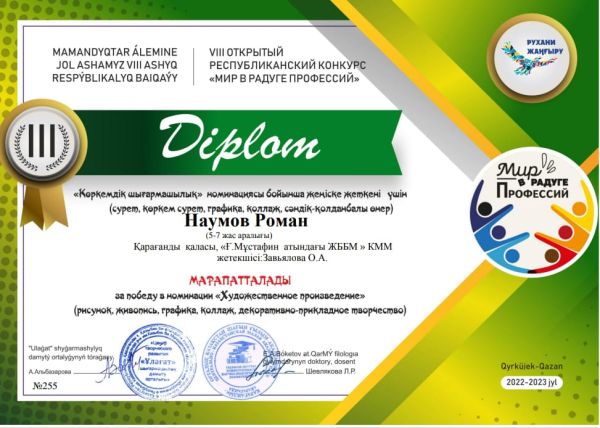 "Мамандықтар кемпірқосағындағы әлем " Республикалық байқауына қатысқаны үшін" Өнер туындысы "номинациясында жеңіске жеткен
