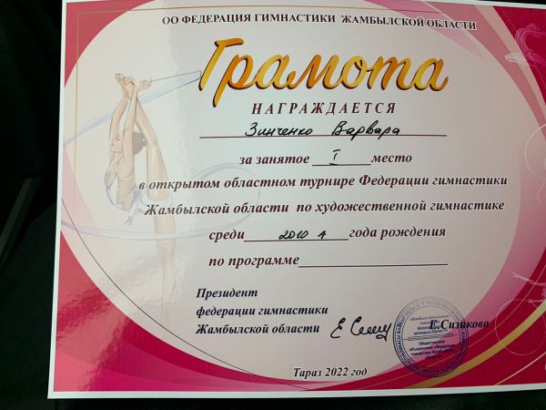 7 "Г" cынып оқушысы Зинченко Варвара Жамбыл облысы гимнастика Федерациясының облыстық ашық турнирінде бірінші орынды жеңіп алды.