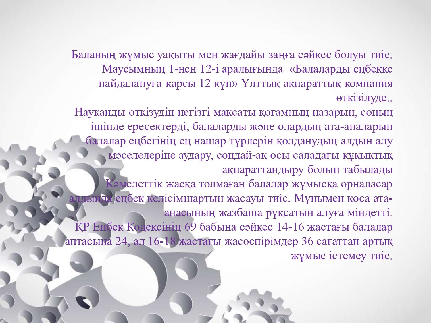 Баланың жұмыс уақыты мен жағдайы заңға сәйкес болуы тиіс. #ҰАН2025_09