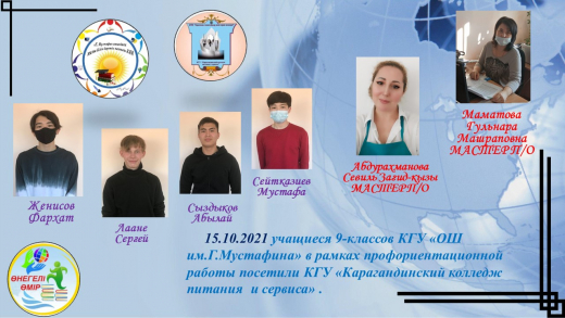 "ВСТРЕЧА С УСПЕШНЫМИ ЛЮДЬМИ" 15.10.2021 В целях реализации проекта «Өнегелі өмір» учащиеся 9-классов КГУ ОШ им.Г.Мустафина встретились с представителями и мастерами колледж…