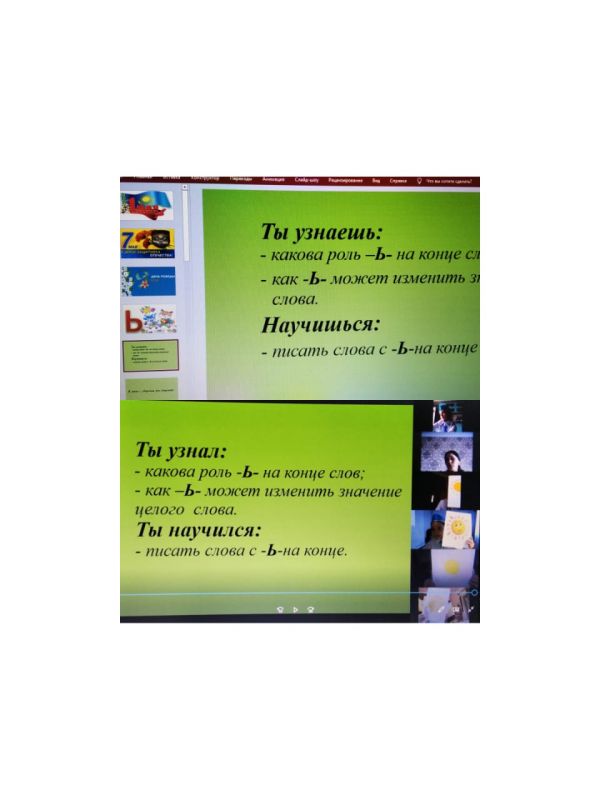 Открытый урок обучения грамоте в 1Е кл. ( кл.рук. Саттыгулова Б.Т.). Тема урока "Мягкий знак в конце слов''. Урок прошёл 29.04.2021г. в режиме онлайн, в преддверии праздников.