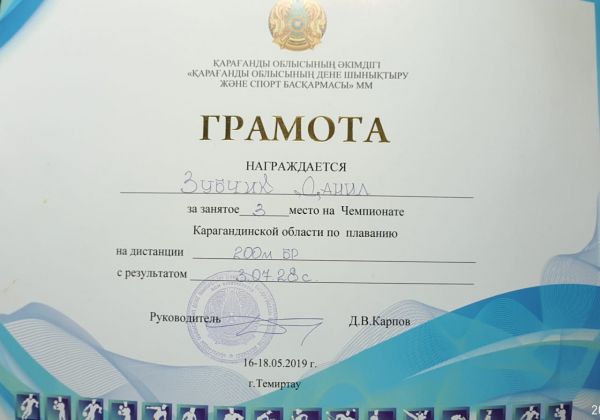 "Облыстық мамандандырылған олимпиада резервінің спорт мектебі" ҚМКМ біріншілігінде ашық суда 3000 м жүзу бойынша 41.45.10 көрсеткішімен 9В сынып оқушысы Зубчик Данил жүлделі 2-ші орынға қо…