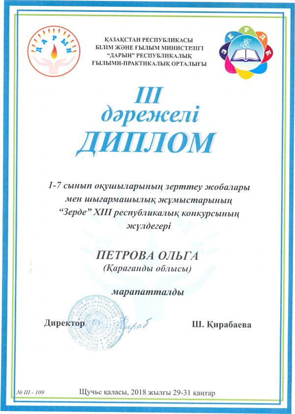29 - 31 қаңтар аралығында Щучинск қаласында «Зерде» XIII республикалық жобалар байқауына Ғ.Мұстафин атындағы № 83 ЖББОМ-ң 6 А сынып оқушысы Петрова Ольга қатысып, ғылыми - зе…