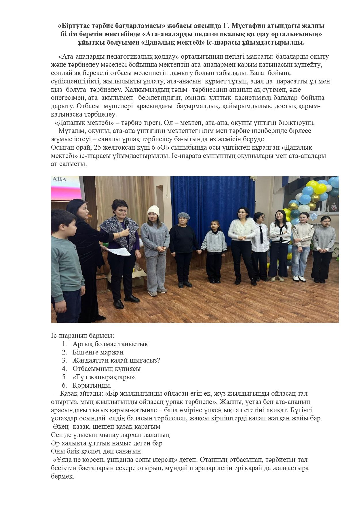 «Біртұтас тәрбие бағдарламасы» жобасы аясында Ғ. Мұстафин атындағы жалпы білім беретін мектебінде «Ата-аналарды педагогикалық қолдау орталығының» ұйытқы болуымен «Данал…