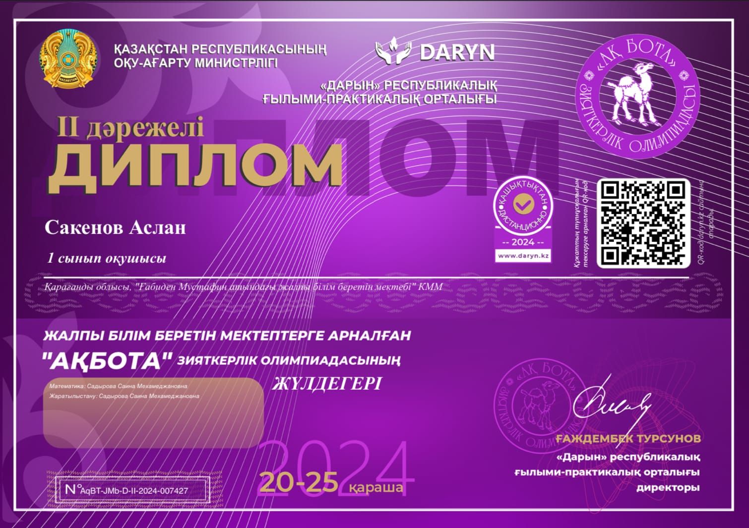 "Ақбота"республикалық олимпиадасында жүлделі орындарға ие болған 1" В " сынып оқушылары: