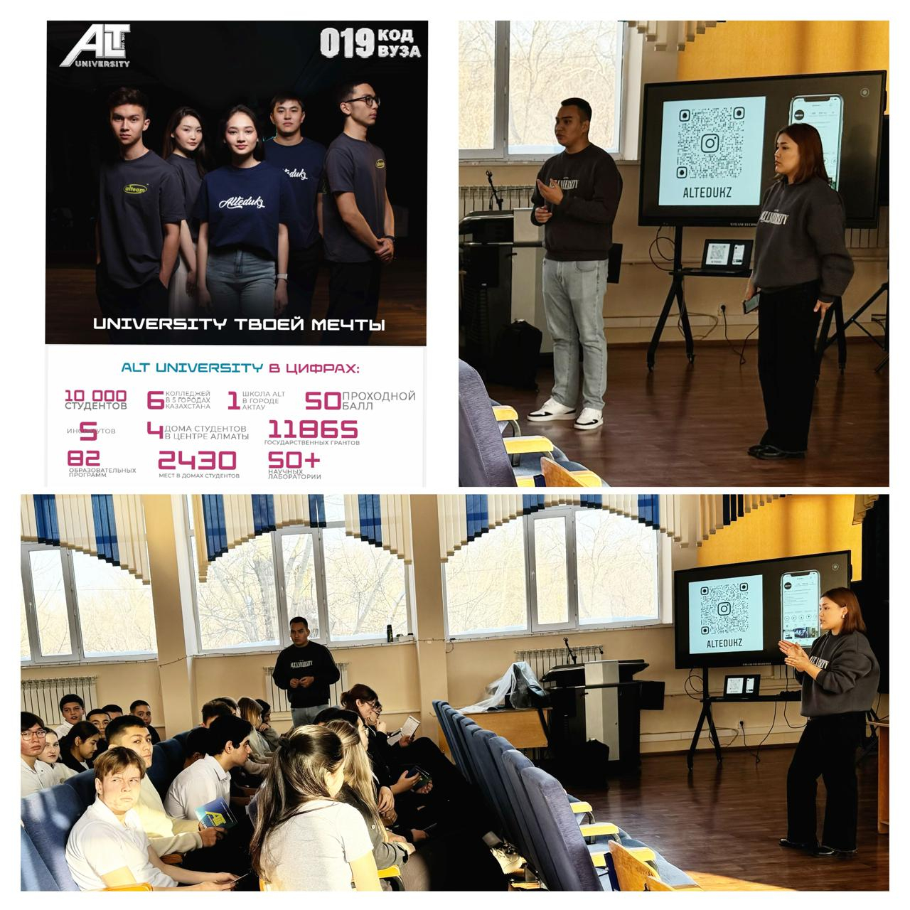 Бүгін 19.11.2024 ж. мектебіміздің 11-сынып оқушыларына Алматы қаласының ALT UNIVERSITY өкілдері кәсіби бағыт бағдар беру жұмыстарын өткізді. Университет туралы мағлұмат беріп, оқушылардың сұрақтарына жауап берді.