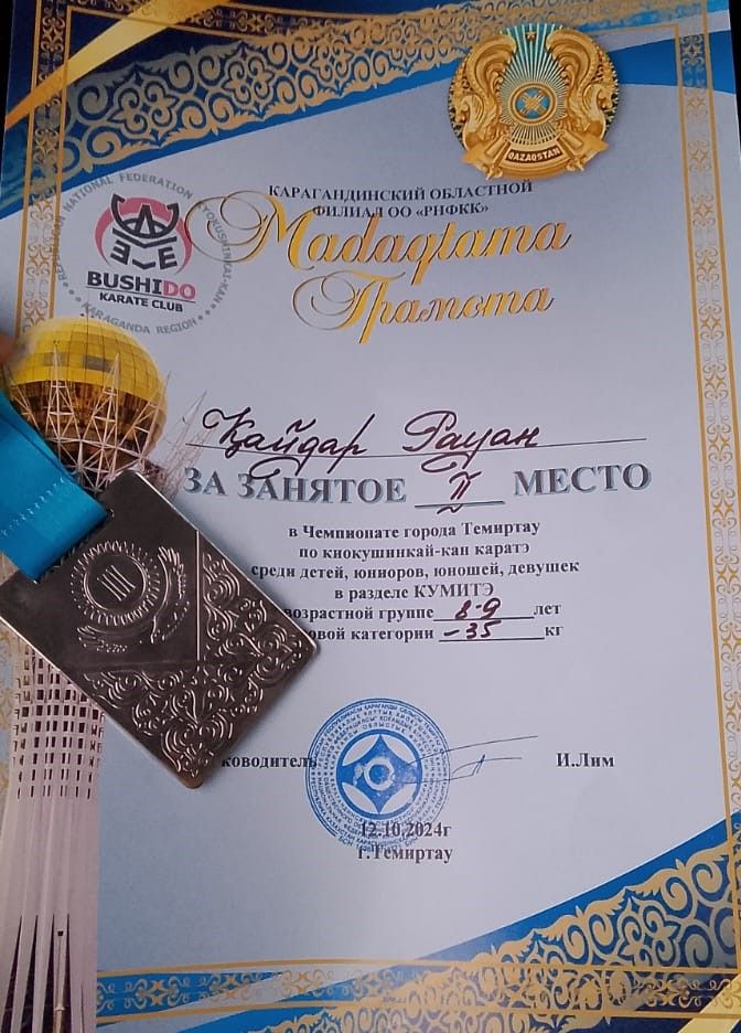 12.10.2024г. ученик 3Е класса Қайдар Рауан принял участие в чемпионате г.Темиртау по каратэ в разделе КУМИТЭ и занял почетное 2 место. Поздравляем Рауана и желаем успехов и побед.