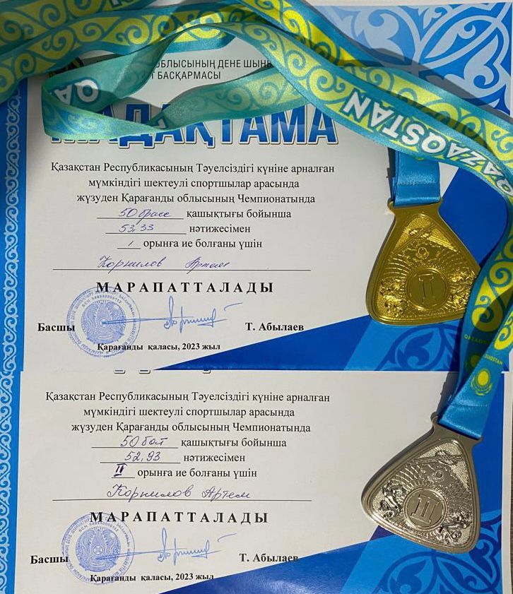 Ученик 5 А класса Корнилов Артем занял первое место на чемпионате Карагандинской области по плаванию среди спортсменов ко Дню Независимости Республики Казахстан.