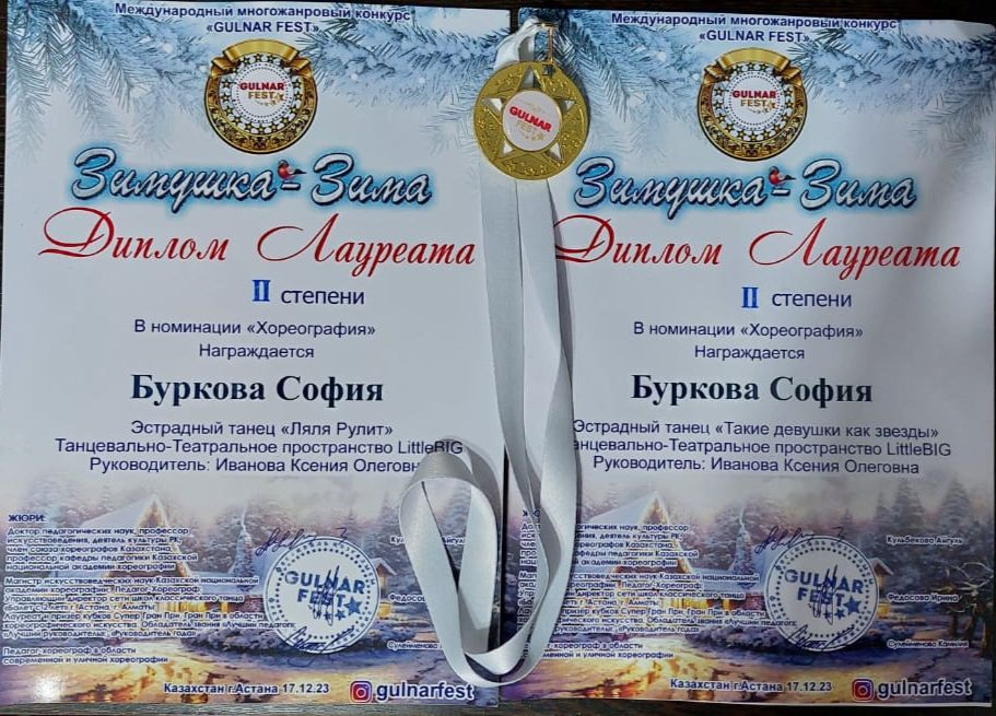 Международный многожанровый конкурс "GULNAR FEST" прошёл в г. Астана в преддверии Нового 2024 года. Учащаяся 2 "Г" класса Буркова София награждена Дипломами II степени в номинаци…