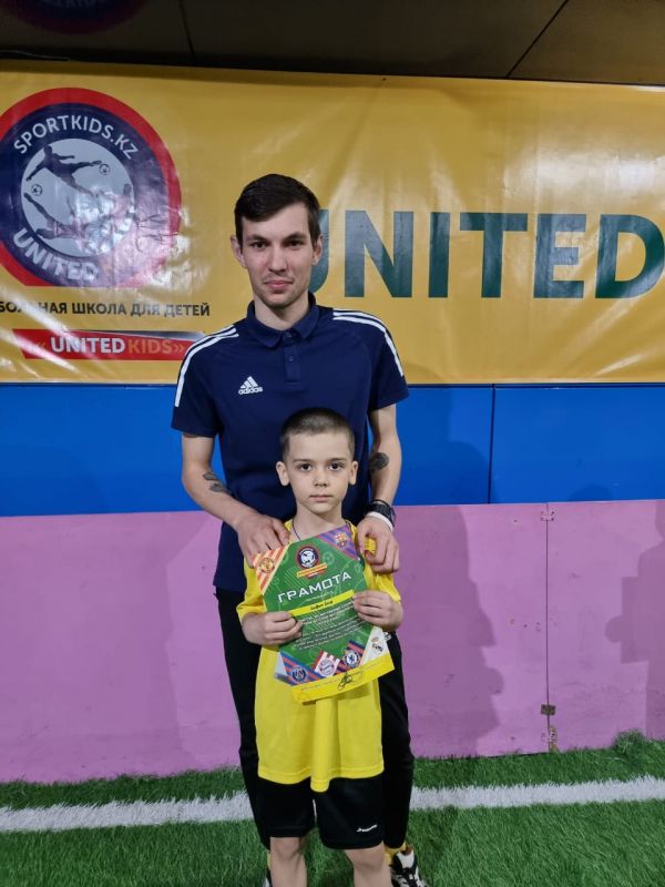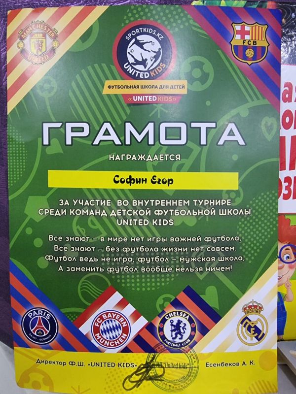 Грамотой награждается ученик 1 "Г" класса Софин Егор, за участие во внутреннем турнире среди команд детской футбольной школы «UNITED KIDS».