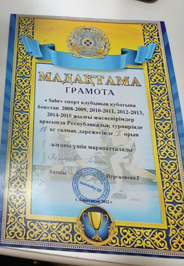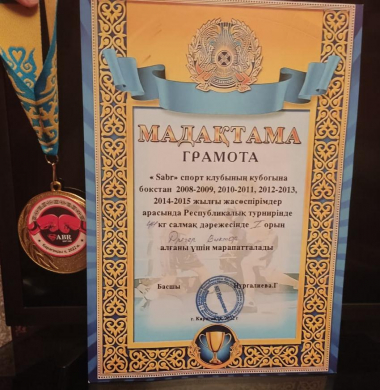 Ахмедиев Абылай ученик 1 "Г" класса занял первое место в весовой категории 28 кг в Республиканском турнире по боксу среди юниоров на кубок спортивного клуба «Sabr».