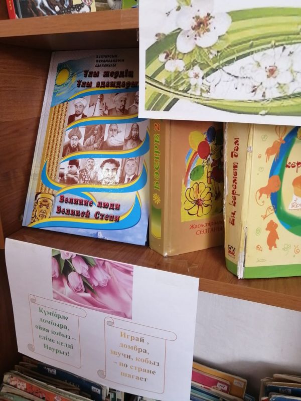 Согласно плану мероприятий, посвящённого празднованию Наурыза ,14 марта 2022 года библиотека КГУ ОШ им. Г.Мустафина оформила книжную выставку: «Күмбірле домбыра, ойна қобыз– ел…