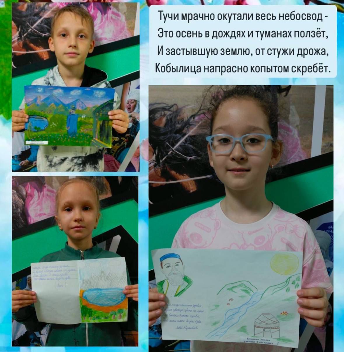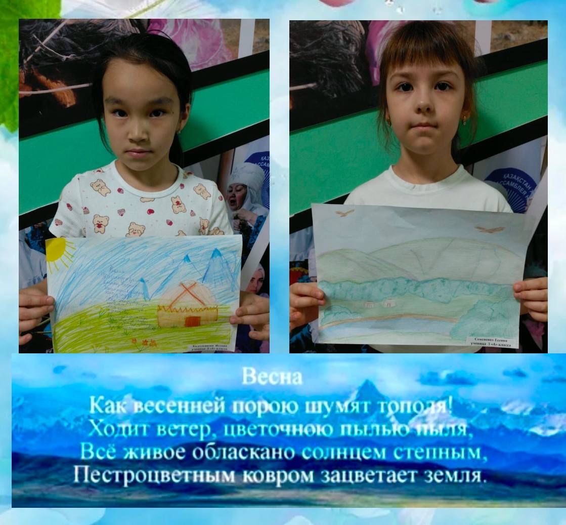 Создание иллюстраций к стихам Абая о временах года. 2 "Ә " класс Произведение Абая Кунанбаева "Күз "Әлімжан Т "Жаз" Дархан Е ЖазғытұрыТұрсынхан Мұратбек