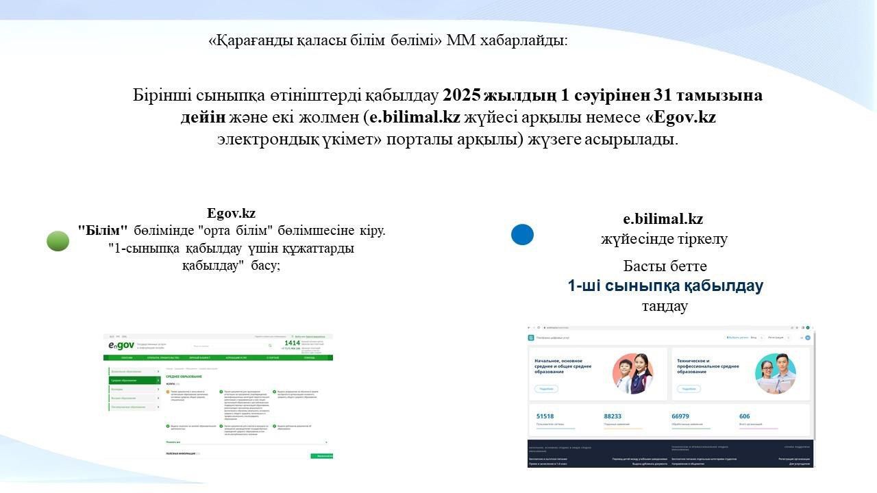 Прием документов от родителей или законных представителей ребенка, поступающих в первый класс, производится с 1 апреля по 31 августа 2025 года через порталы e.gov или e.bilimal.kz.