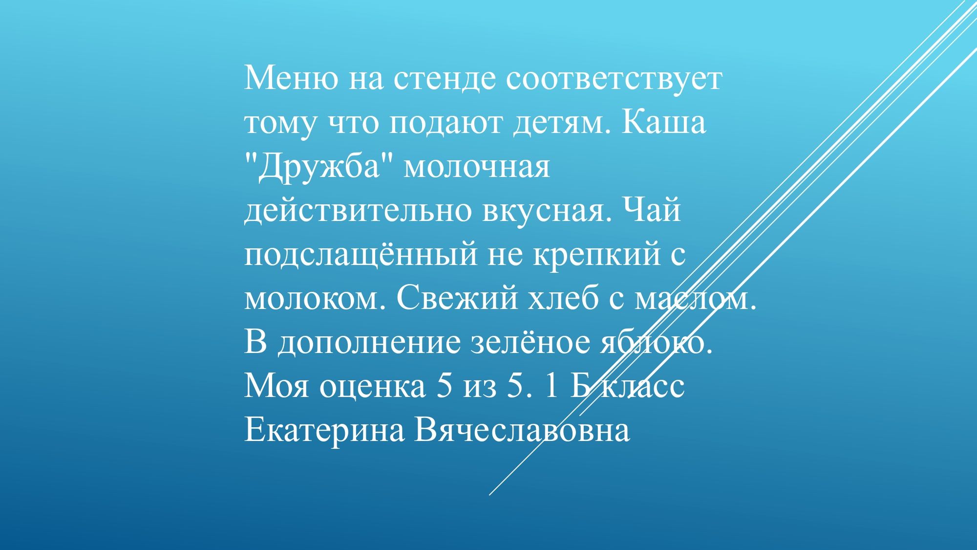 Меню на стенде соответствует тому что подают детям. Каша "Дружба" молочная действительно вкусная. Чай подслащённый не крепкий с молоком. Свежий хлеб с маслом. В дополнение зелёное яб…
