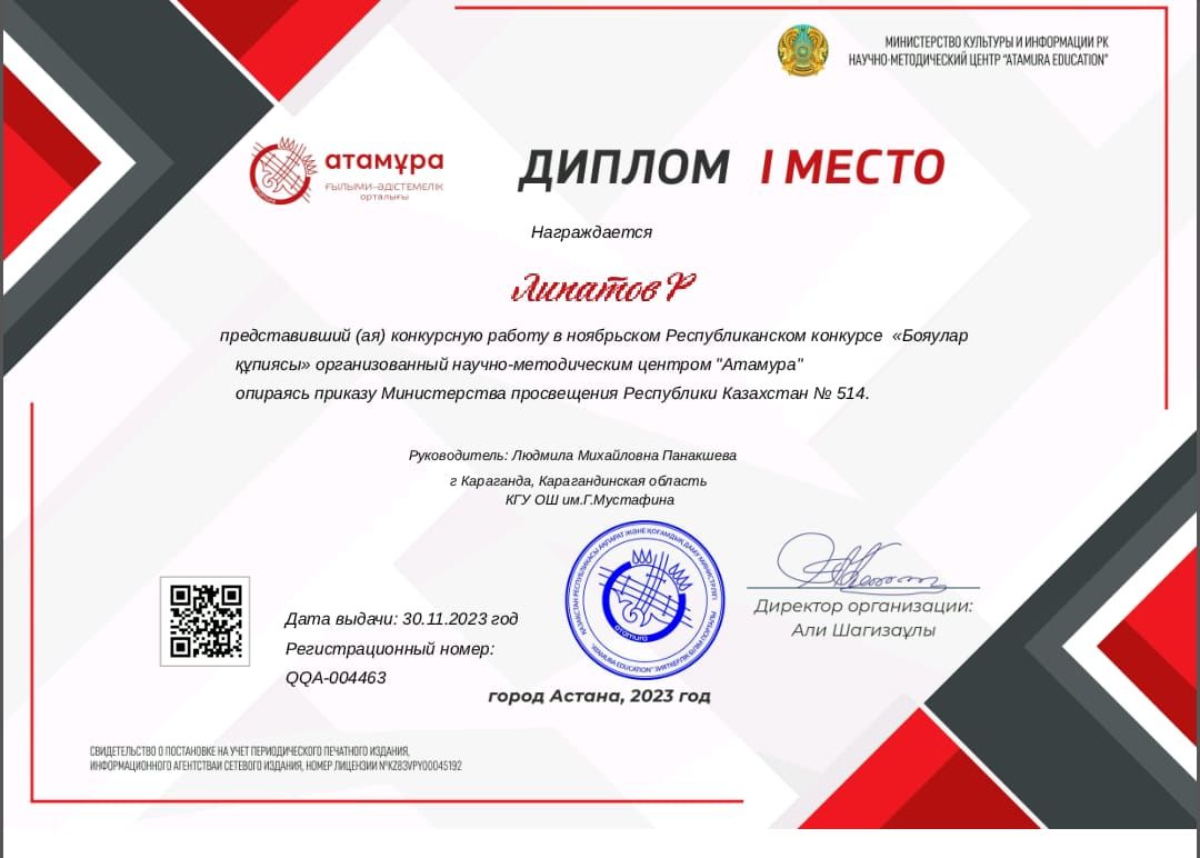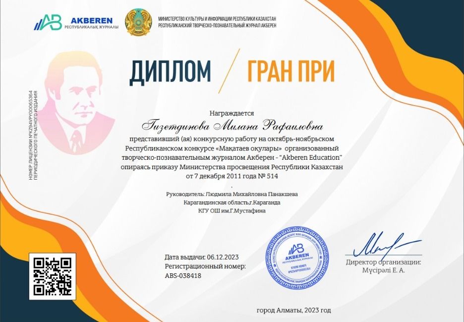 Ученица 4"А "класса Гизетдинова Милана награждена Дипломом Гран-При в Республиканском конкурсе "Макатаевские чтения".Молодец!